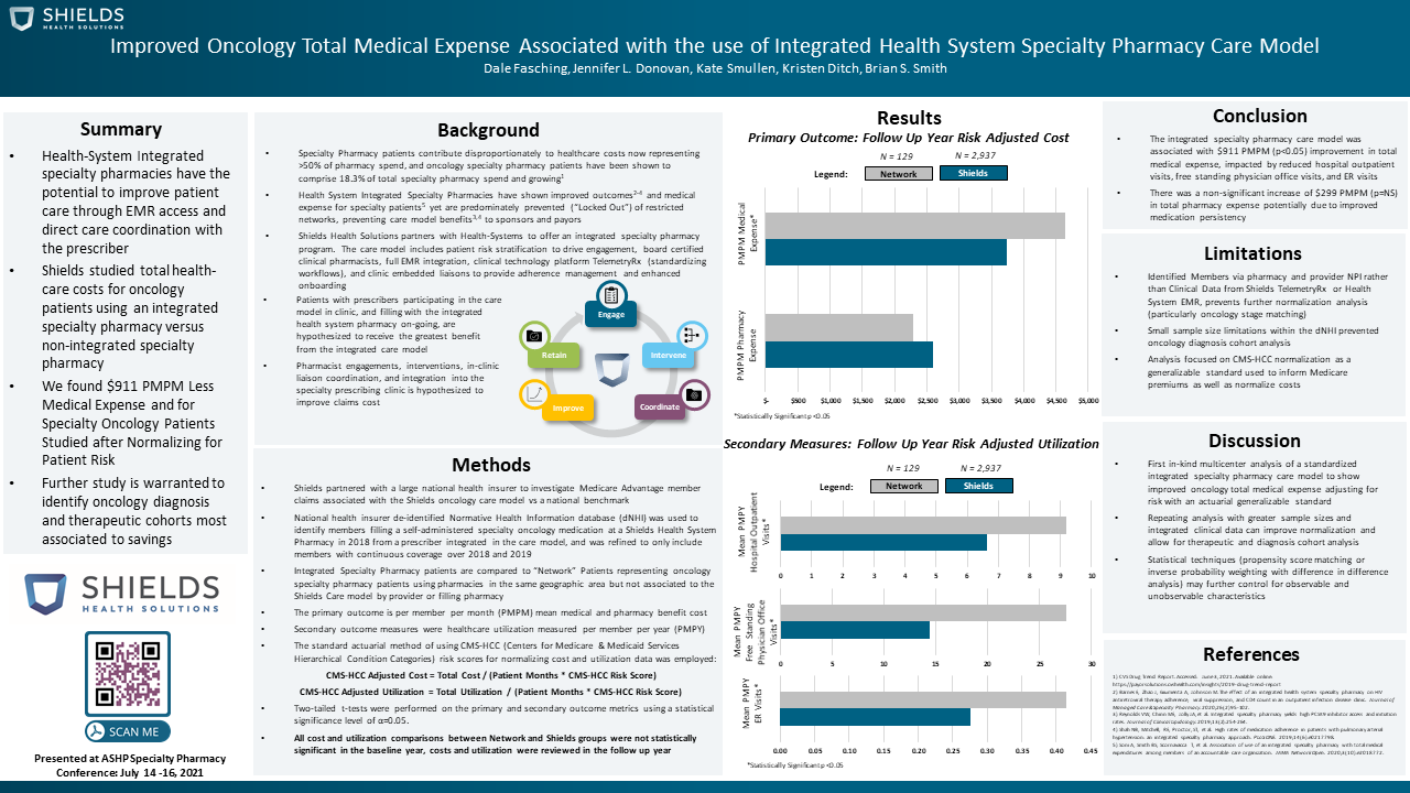 “Integrated health system specialty pharmacies have shown superior patient outcomes in many studies. There is a lack of data available to show how integrated health system specialty pharmacy care impacts claims cost to benefit health plans and health plan sponsors,” said Dale Fasching, Pharm D, MBA, Director of Strategic Operations, Shields Health Solutions. “The work of Shields health system partners and the Shields care team has allowed for measurable benefit in improved medical benefit expense for specialty oncology subpopulations. This is noteworthy, as it may improve the access to integrated specialty pharmacy care for broader populations and allow health systems to retain the pharmacy care of the oncology patients they serve.”